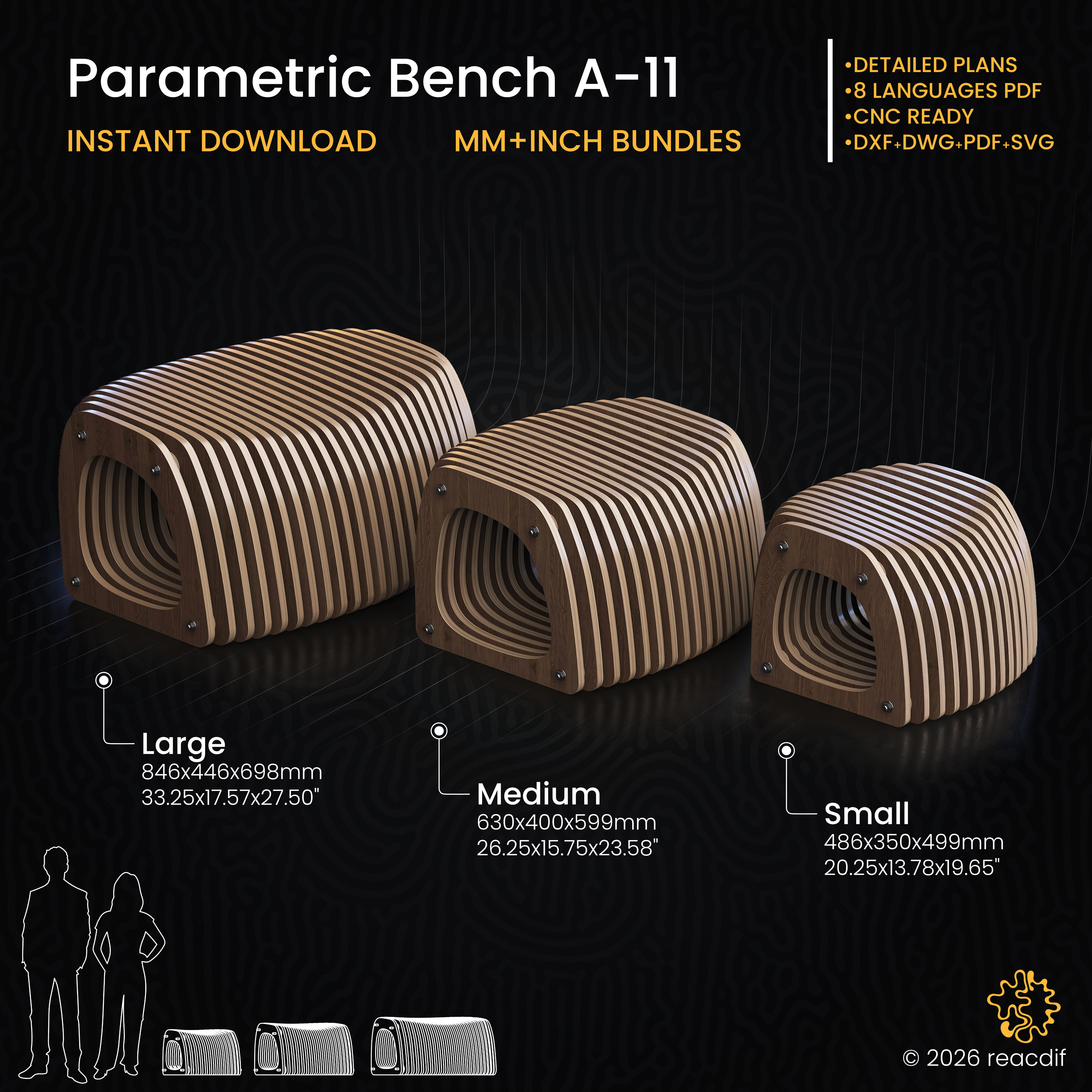 Home N PeopleProfessional parametric bench design files for CNC cutting. Multi-functional seating for entryways, gardens, or dining areas. Sturdy construction with integrated storage options available. Perfect for indoor and outdoor use. Bundle of all variants included (MM, INCH, Small, Medium, Large, etc). Includes DXF, DWG, SVG, and PDF cutting files in both metric and inch units. Assembly instructions available in 8 languages (downloadable below). Instant digital download.