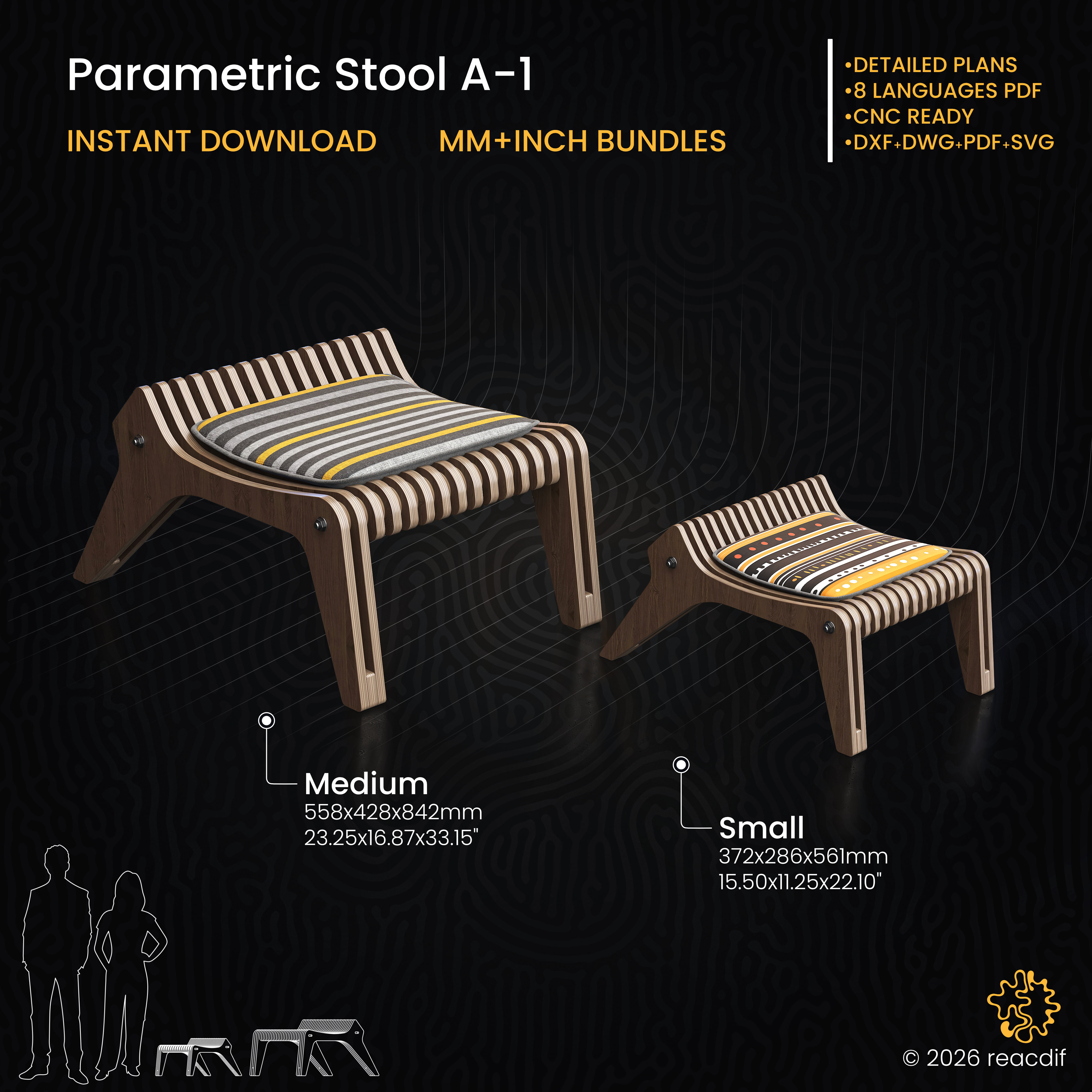 Professional parametric stool design files for CNC cutting. Space-saving seating with minimalist design. Ideal for kitchens, bars, and compact living areas. Stackable for easy storage. Perfect for indoor and outdoor use. Bundle of all variants included (MM, INCH, Small, Medium, Large, etc). Includes DXF, DWG, SVG, and PDF cutting files in both metric and inch units. Assembly instructions available in 8 languages (downloadable below). Instant digital download.