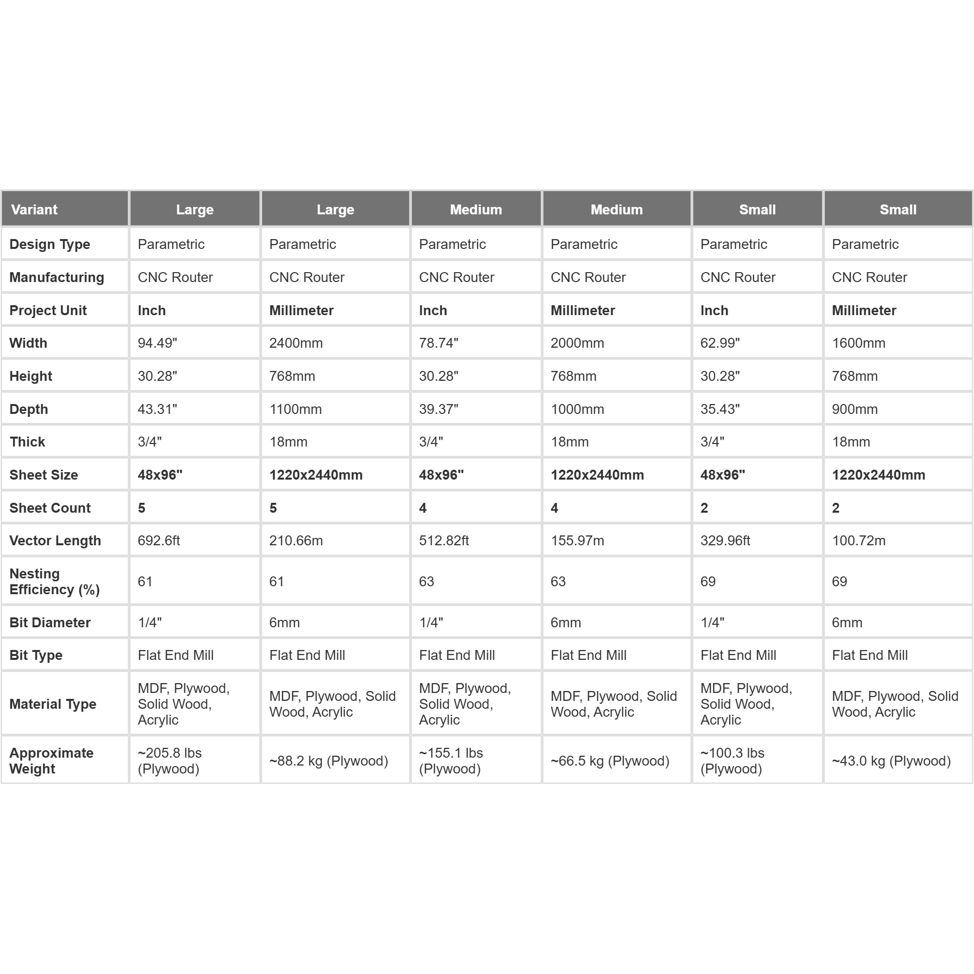Professional parametric dining table design files for CNC cutting. Family gathering centerpiece with extendable options. Accommodates 4-8 people comfortably, perfect for daily meals and entertaining guests. Perfect for indoor and outdoor use. Bundle of all variants included (MM, INCH, Small, Medium, Large, etc). Includes DXF, DWG, SVG, and PDF cutting files in both metric and inch units. Assembly instructions available in 8 languages (downloadable below). Instant digital download.